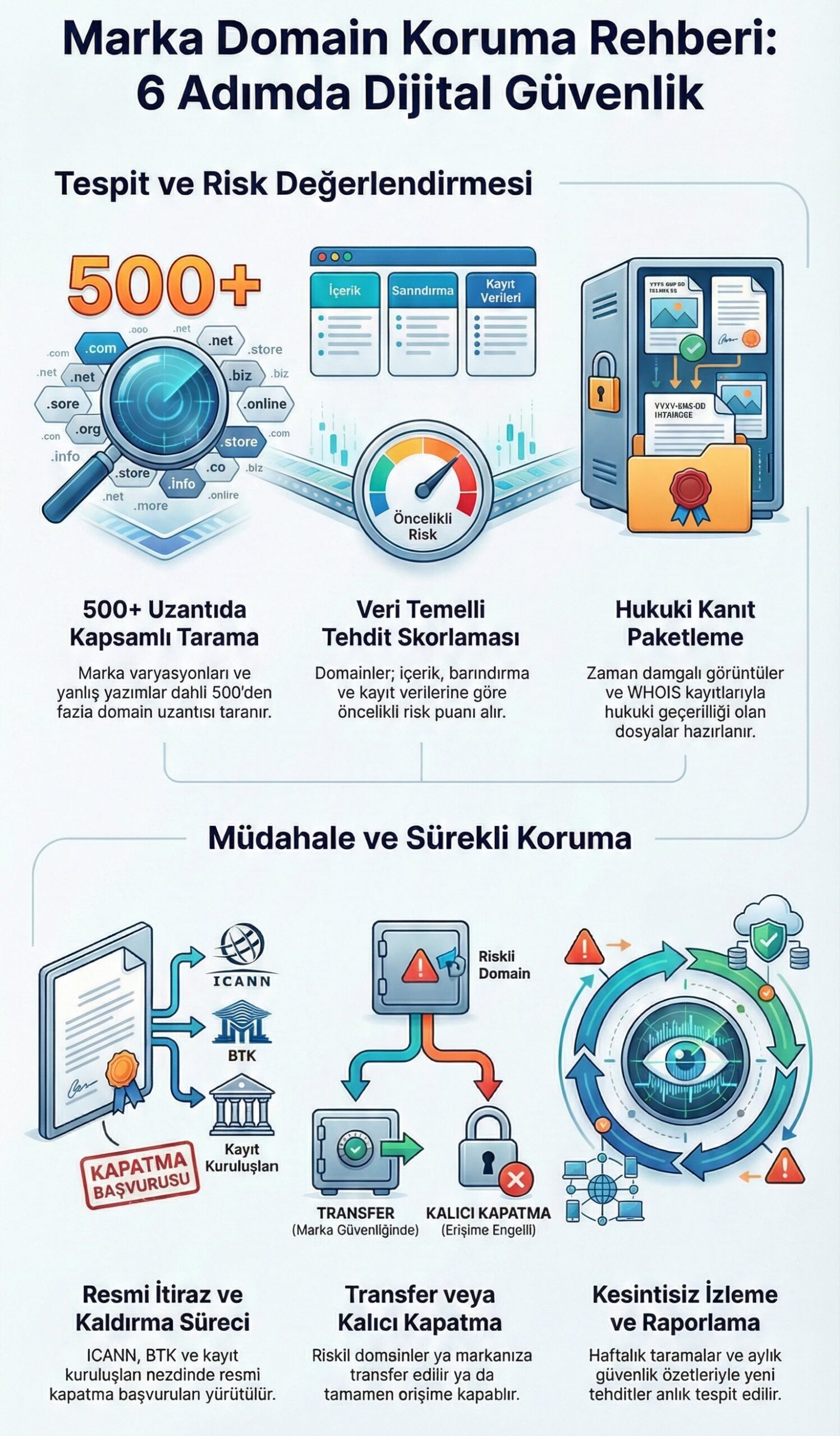 - Türkiye’de faaliyet gösteren markalara özel domain koruma deneyimiyle, hem yerel (.tr) hem de uluslararası uzantılarda aktif izleme yapıyoruz. ICANN politikaları, BTK mevzuatı ve Türk Ticaret Kanunu çerçevesinde hukuki süreçleri yönetiyor; gerektiğinde iş ortağı hukuk büroları ile koordineli şekilde ilerliyoruz.